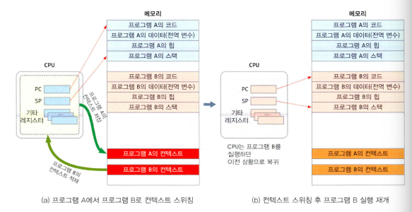 - 실행중인 프로그램의 컨텍스트를 저장해두고 다른 프로그램의 컨텍스트를 CPU로 옮기는 것