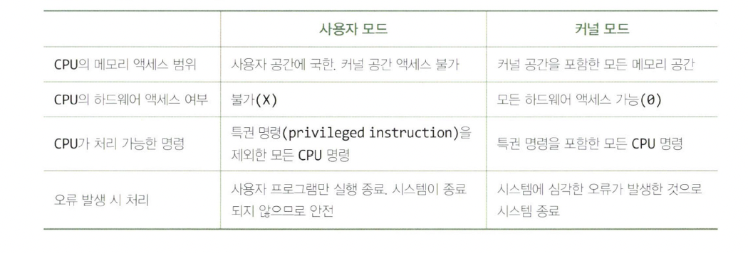 - 시스템 콜이 끝나면 CPU의 기계 명령에 의해 사용자 모드로 변경