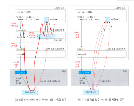-> 표준 라이브러리 함수가 버퍼를 확인하고, 시스템 호출 라이브러리 함수를 호출한다