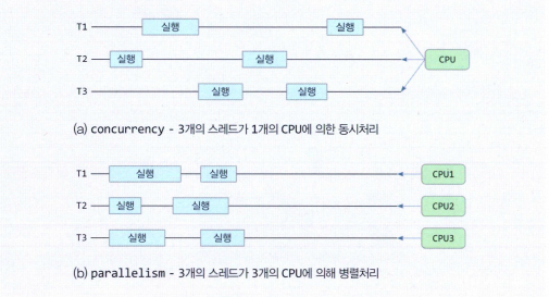 - 2개 이상의 스레드가 서로 다른 CPU(코어)에서 동시에 실행되는 것