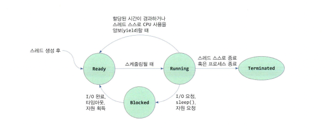 - 스레드 스스로 종료하거나 프로세스가 종료되거나