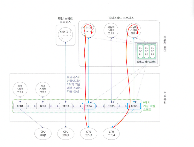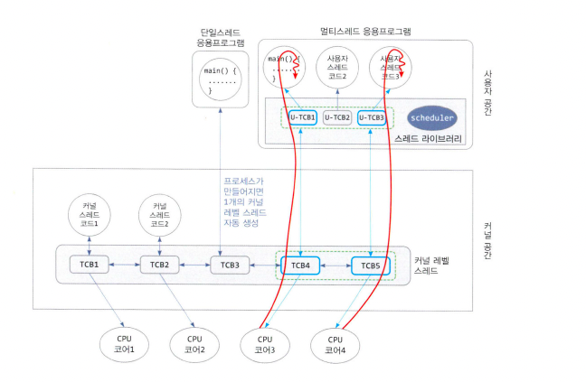 - 커널이 스케줄링을 통해 TCB 선택 시, 사용자 레벨 스레드 코드를 실행