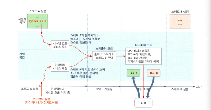 - 기존에 실행되던 스레드 A의 TCB에 현재 레지스터 값을 저장하고, 새로 실행될 스레드 B의 TCB에 저장된 레지스터 값을 CPU에 복사한다(이것이 컨텍스트 스위칭이다)