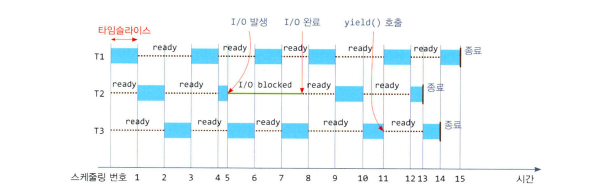 - 운영체제(커널)는 타임 슬라이스를 정하고 타이머를 통해 이 시간이 되면 스레드를 강제 중단시켜 준비 리스트에 삽입한다