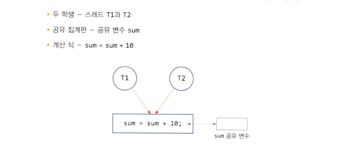 - 훼손을 막기 위해, 반드시 한 스레드만 배타적 독점적으로 실행하도록 관리되어야 함