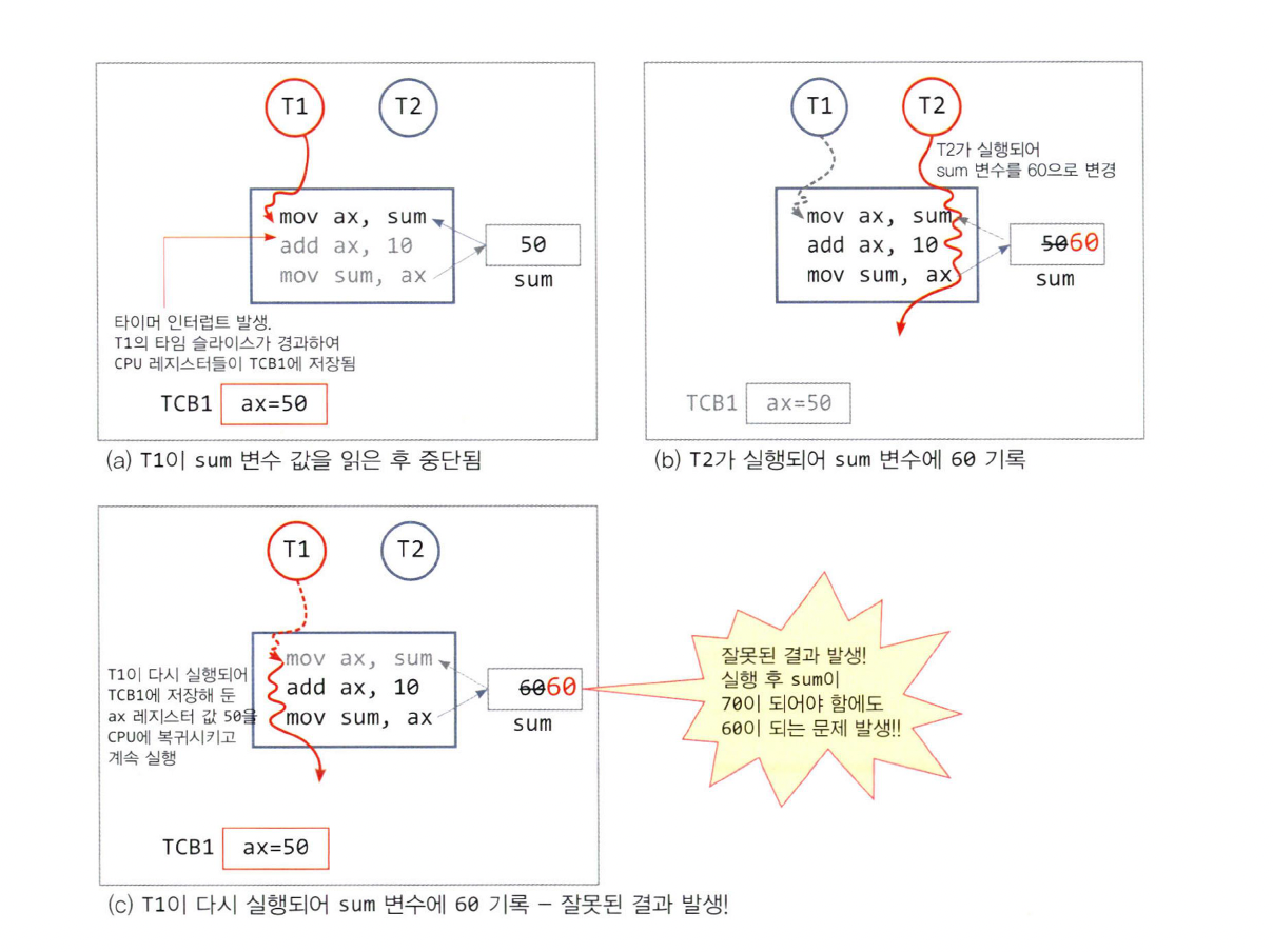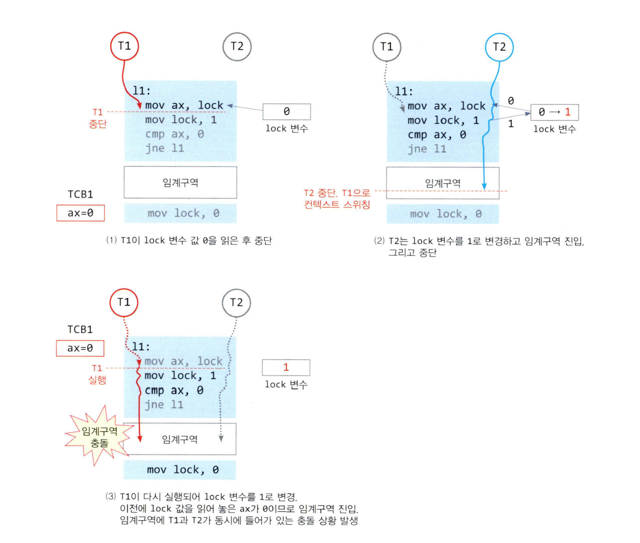 - 중단 이전에 읽어놓은 lock값 0이 ax에 저장되어 있어서 임계구역으로 진입하게 되고 T1, T2가 모두 임계구역에 있어 상호배제에 실패하게 된 상황