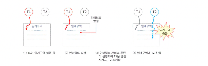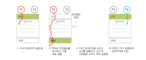 - 임계구역으로 진입할 때 entry 코드를 통해 인터럽트 서비스를 금지하고 exit 코드에서 다시 허용하도록 한다