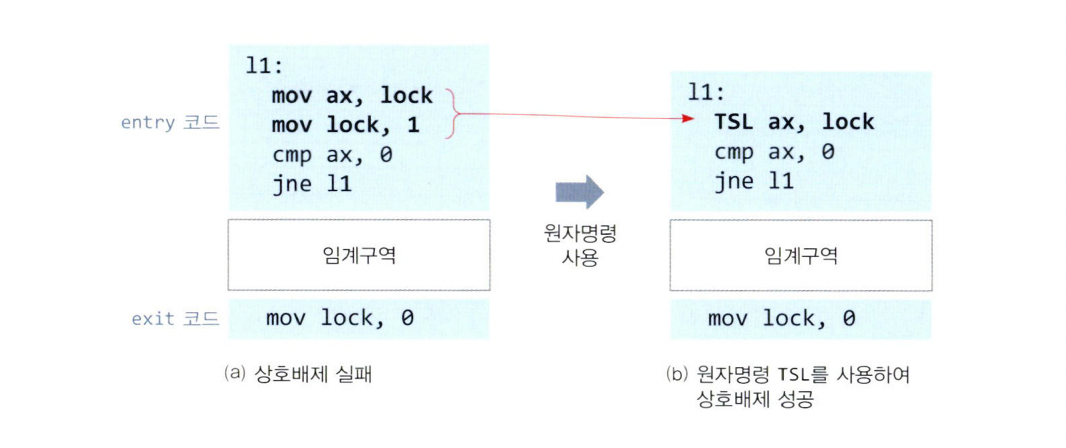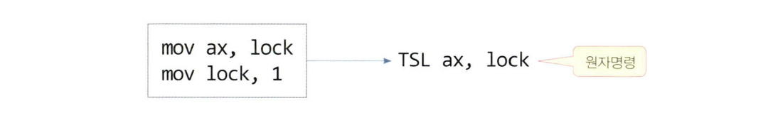 - 원자명령(aomic instruction, TSL(Test and Set)이라고도 한다) 도입하여 두 명령을 하나의 명령으로 만드는 것