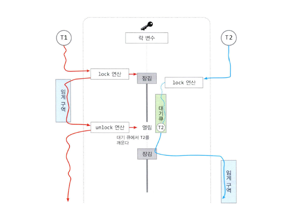 락 변수를 이용하여, 한 스레드만 임계구역에 진입시키고 다른 스레드들은 큐에 대기시키는 기법