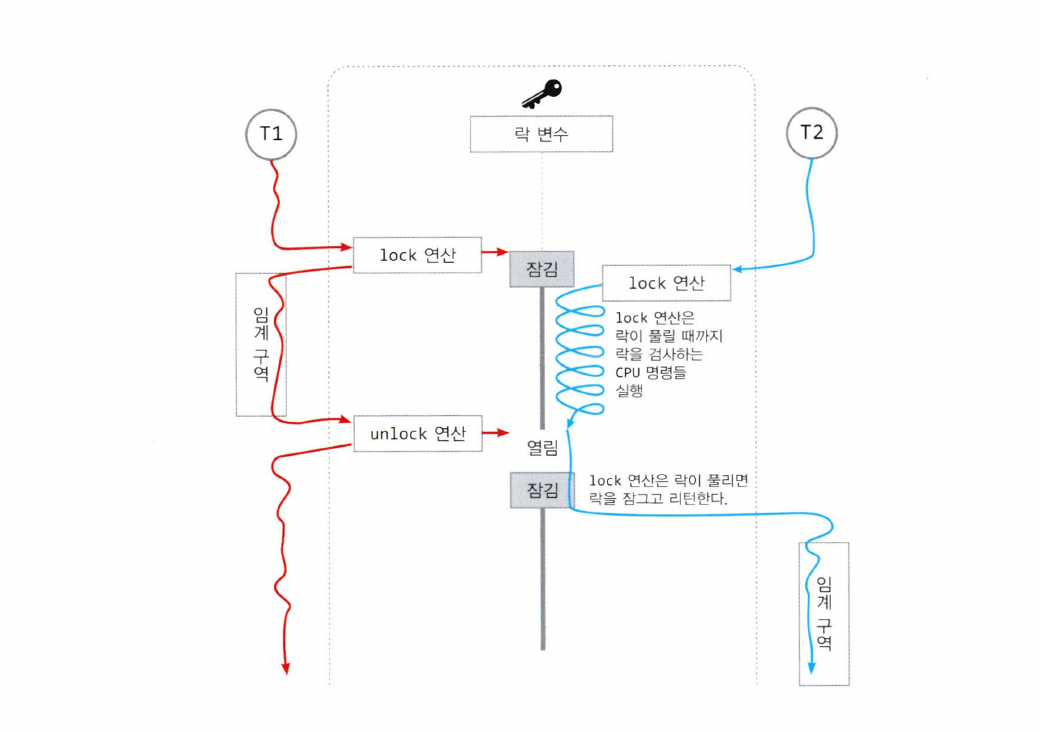 - 하나의 락 변수를 두고, 락을 잠근 스레드만이 임계구역에 진입하도록 하는 기법