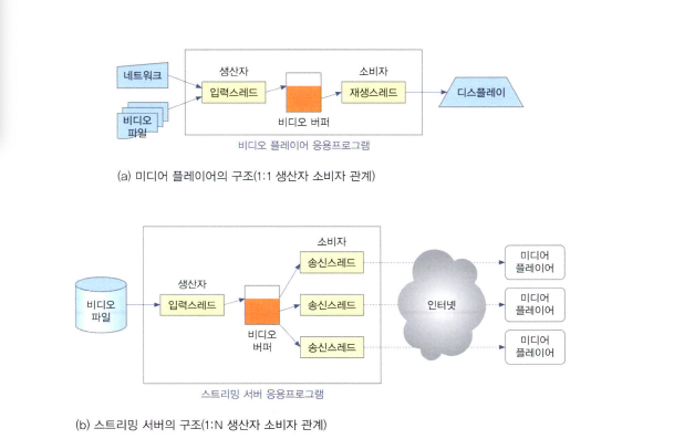 - 공유 버퍼에 데이터를 공급하는 생산자들과 공유 버퍼에서 데이터를 읽고 사용하는 소비자들이 공유 버퍼를 문제없이 사용하도록 동기화 시키는 것 (ex 웹 서버와 클라이언트)
