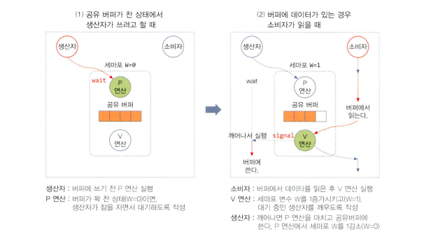 - 꽉 차있는 버퍼를 본 생산자 스레드는 소비자 스레드가 하나라도 비울 때까지 기다려야 하기 때문에 wait-signal 방식으로 세마포 W를 사용한다