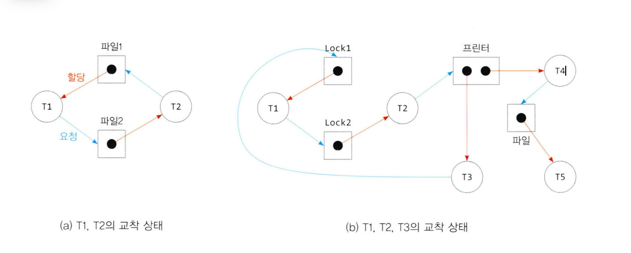 - 한 그룹의 스레드들에서 각 스레드가 다른 스레드가 사유한 자원을 요청하는 환형 고리 형성