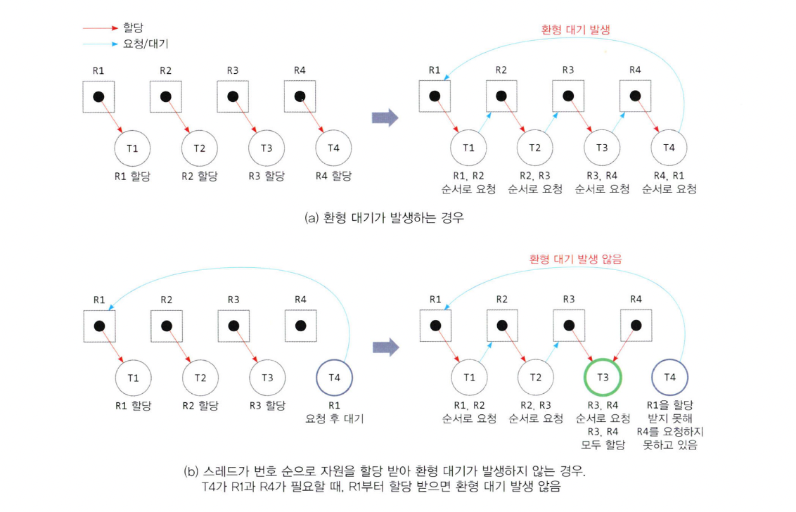 (a)는 자원의 순서가 없어 할당 가능한 것부터 받게되고 나머지는 요청 & 대기하게 되어 교착상태에 빠진다 (b)는 자원에 번호를 매겨(R1~R4가 1~4의 순서를 가짐) 스레드가 반드시 자원의 번호 순대로 할당받도록 한다 T4는 (R4, R1)이 필요하고 반드시 R1부터 할당받아야 하지만 T1이 소유하고 있으므로 요청 & 대기 상태가 되고 R4 자원은 T3가 할당받으며 교착상태가 아니게 된다