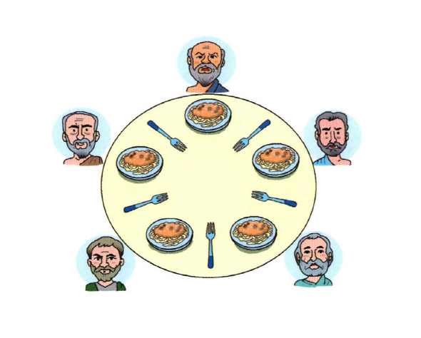 철학자와 5개의스파게티, 5개의포크가 있다 - 스파게티는 무한으로 보충되며, 철학자는 가끔씩
